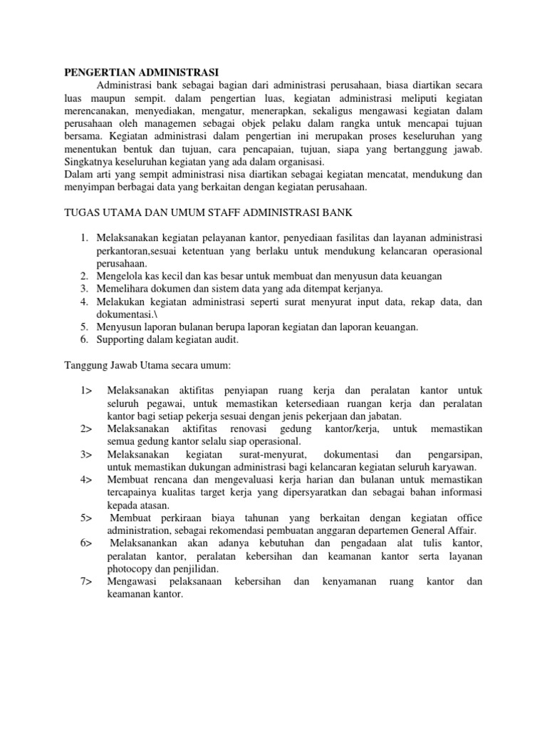 Beberapa di antaranya seperti. Deskripsi pekerjaan Tugas dan Tanggungjawab Staf Administrasi Asuransi Koperasi Karyawan Bisnis Indonesia adalah sebagai berikut. Berikut beberapa jenis tugas staff administrasi di berbagai sektor yang akan dijelaskan secara detail di bawah ini.